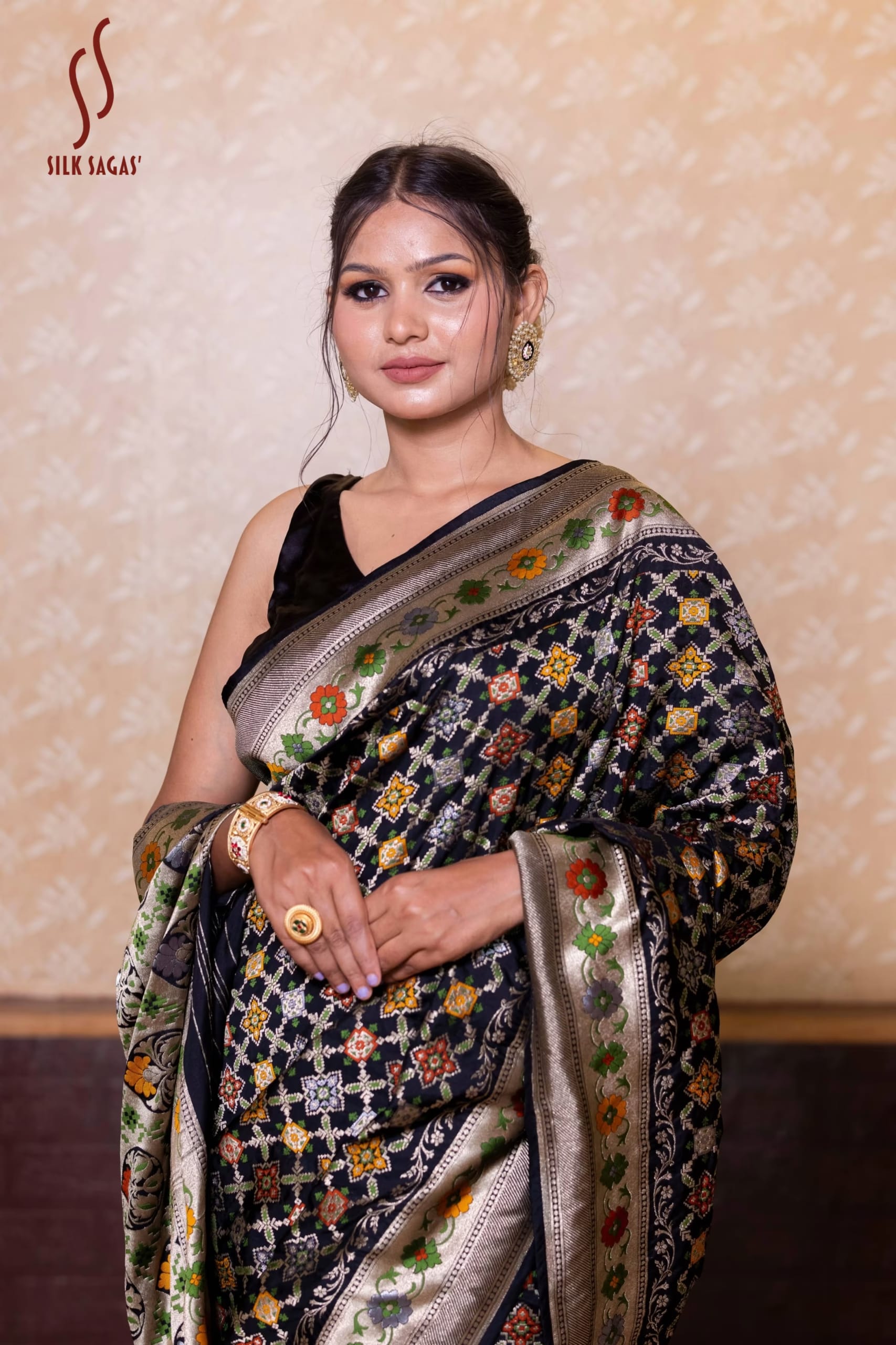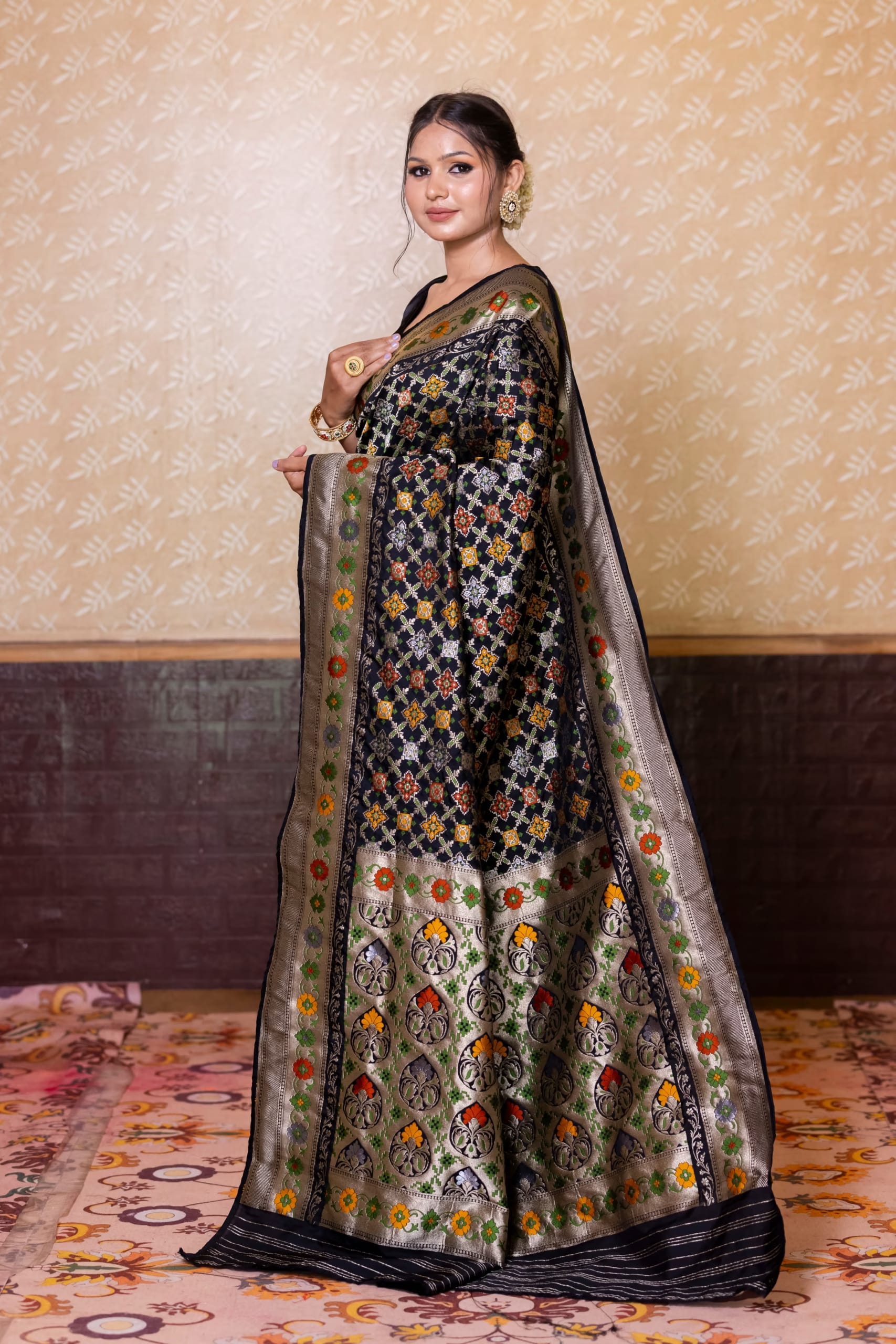 These rich patterns, featuring shades of orange, yellow, green, and red, create a stunning contrast against the dark background, giving the saree a festive and opulent feel. The borders and pallu are further embellished with elaborate golden zari work, adding a touch of classic grandeur and intricate detailing. Crafted from premium Mishru silk, this saree offers a rich drape and graceful movement—perfect for those who appreciate tradition infused with color and elegance.