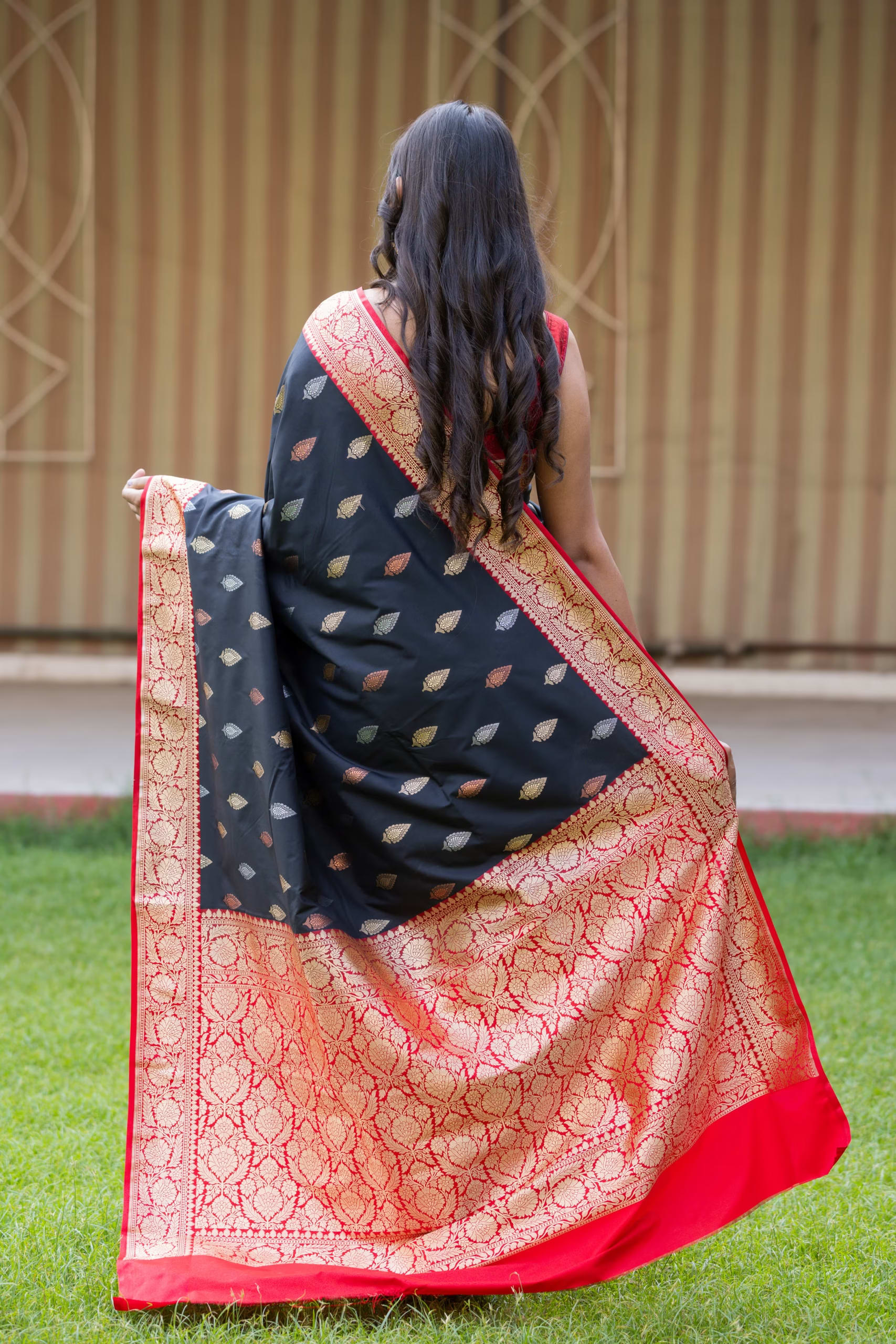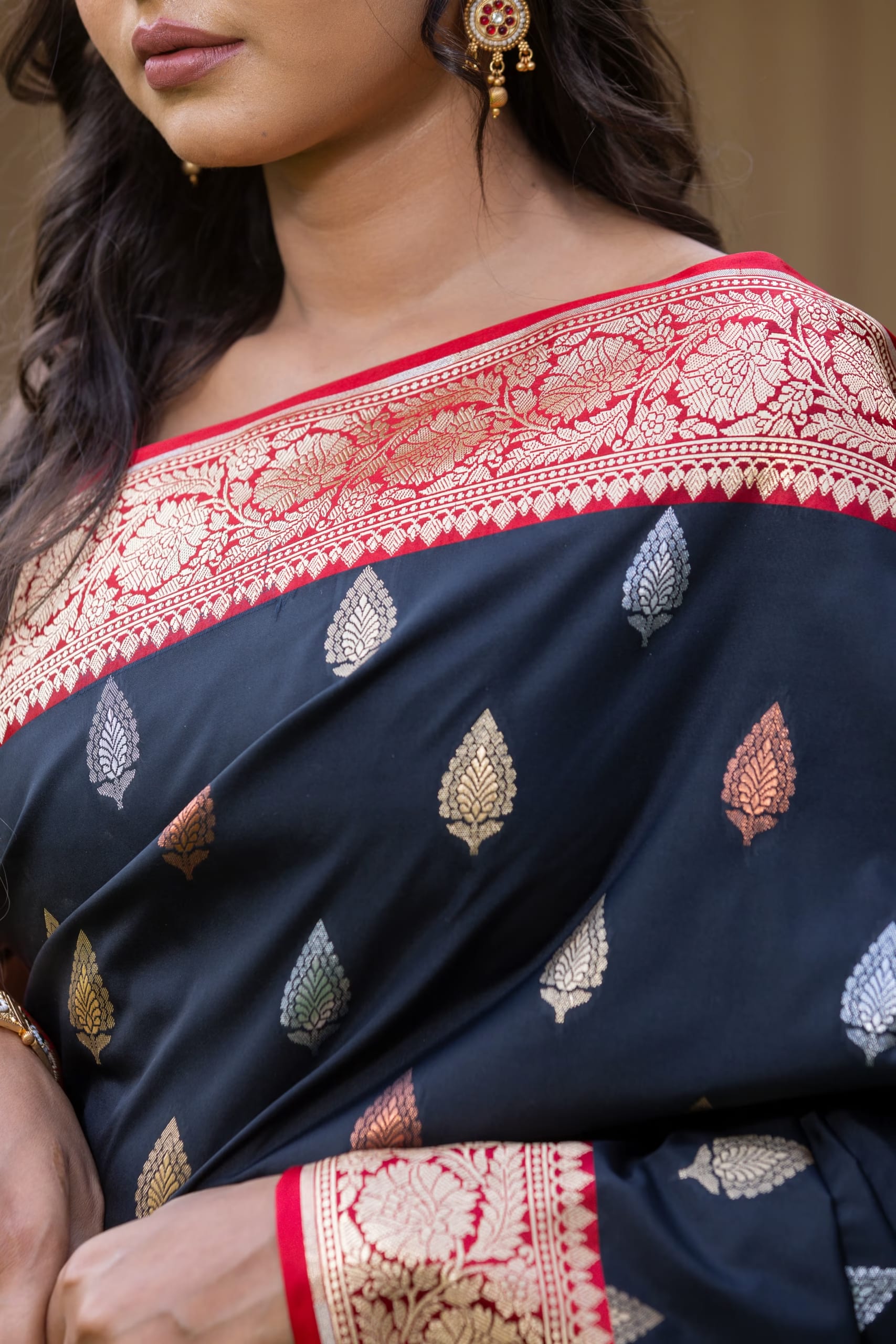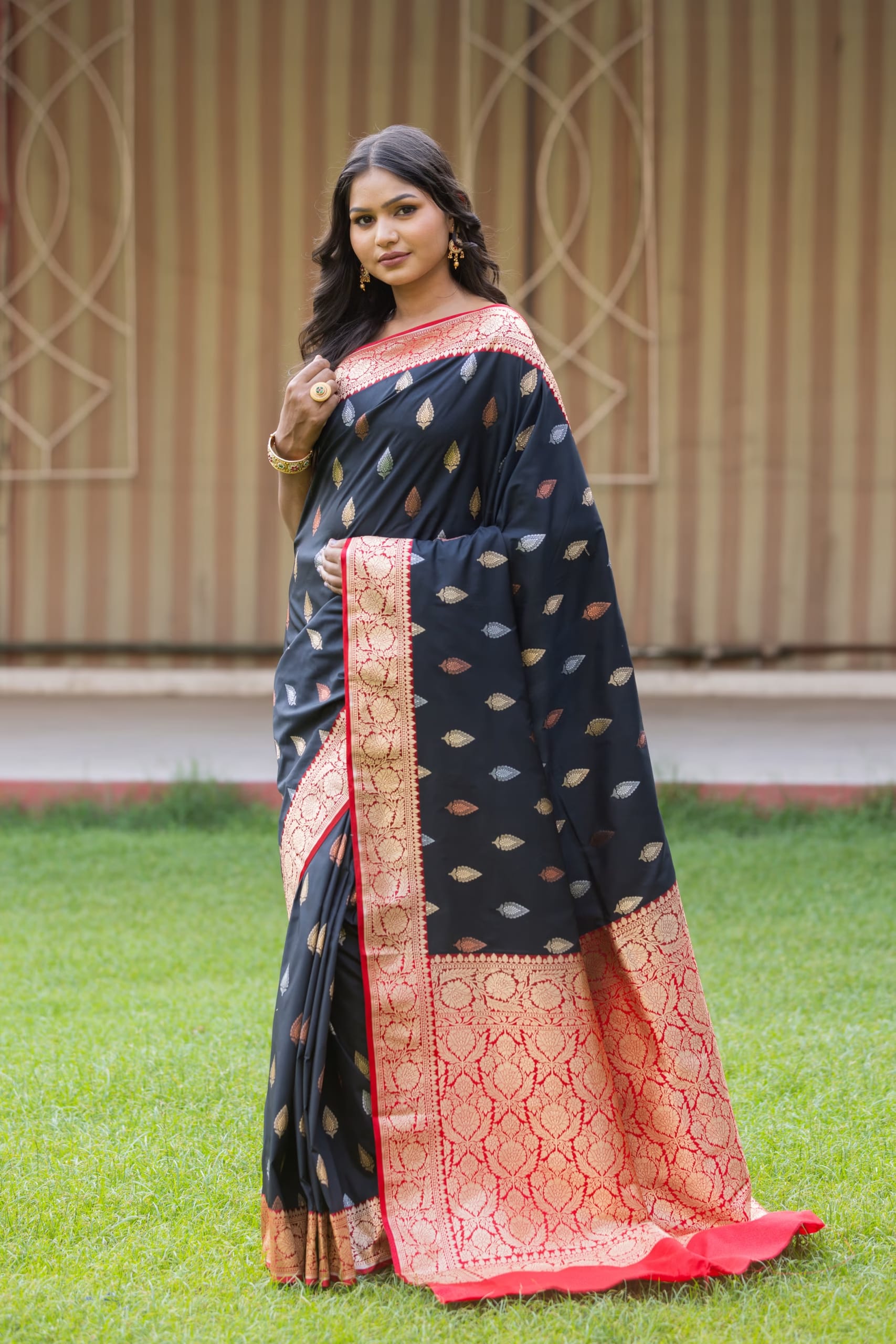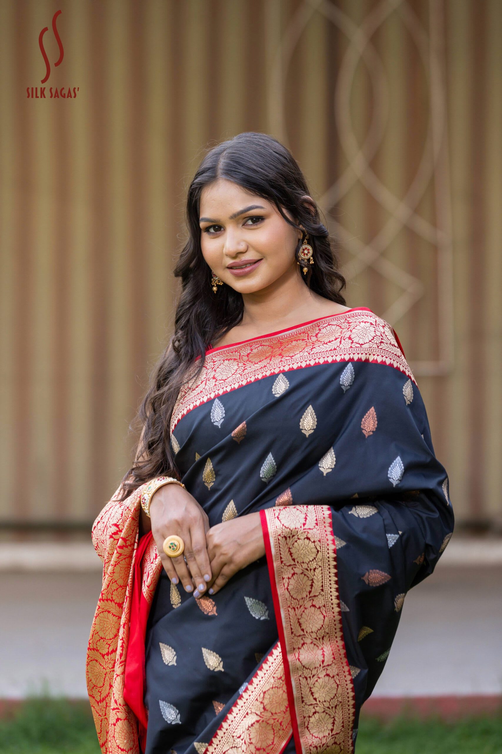Step into timeless elegance with our stunning Katan Silk Saree. The luxurious deep black hue, enhanced by alternating gold and silver zari bootis, offers a mesmerizing interplay of light and shadow. Crafted from premium soft silk, this saree delivers a rich drape and traditional charm perfect for festive occasions and sophisticated gatherings.