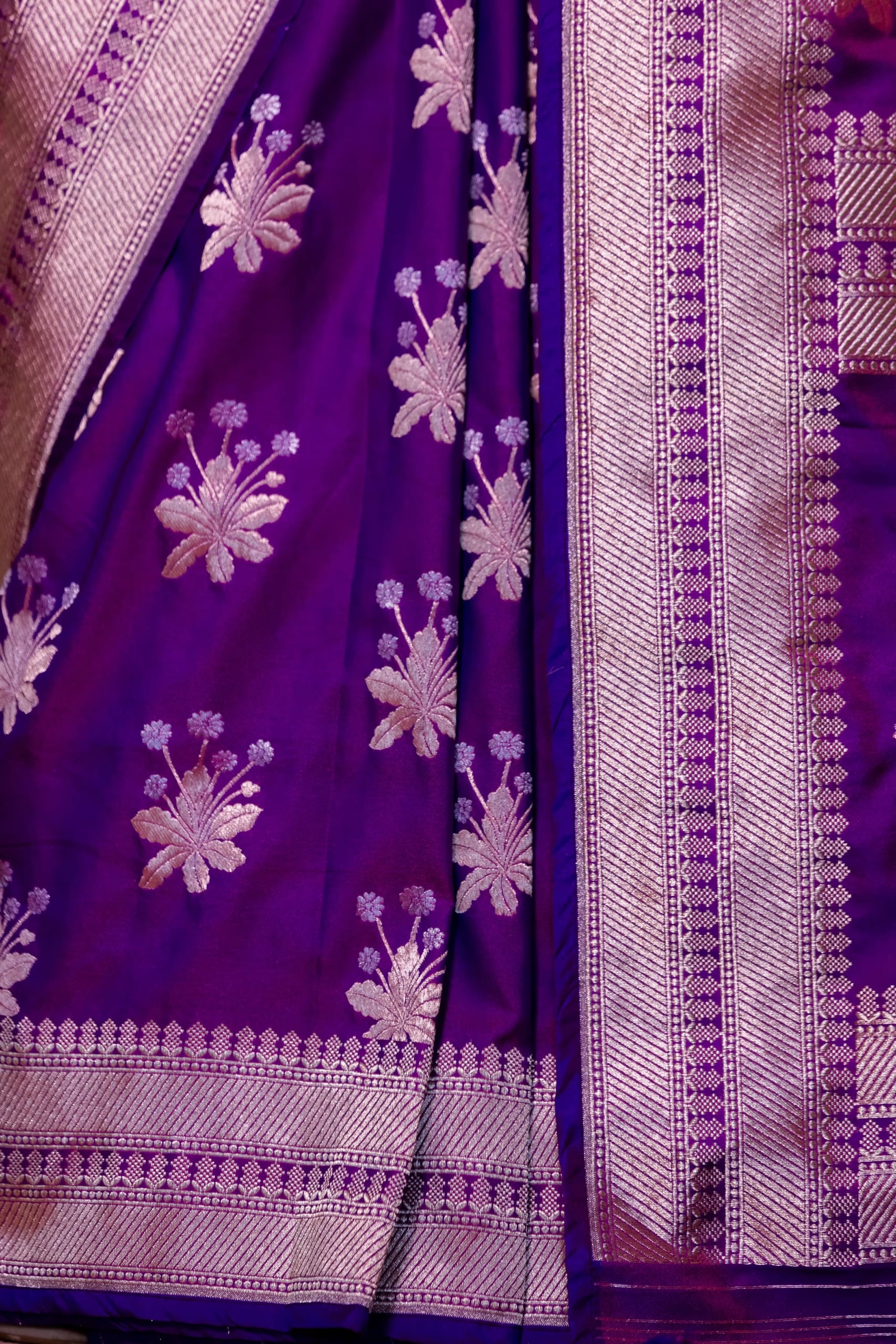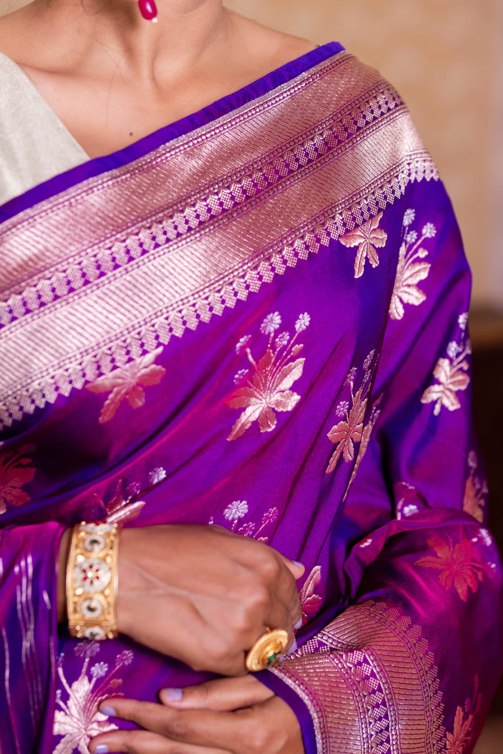 Experience the allure of our Deep Purple Mashru Silk Banarasi Saree, adorned with shimmering golden zari stripes and a vibrant pink selvedge. Crafted from luxurious Mashru silk, this saree offers a regal drape, perfect for weddings and festive occasions. The intricate golden zari border showcases traditional Indian artistry, making it a timeless addition to your ethnic collection. Embrace elegance and heritage with Silk Sagas.