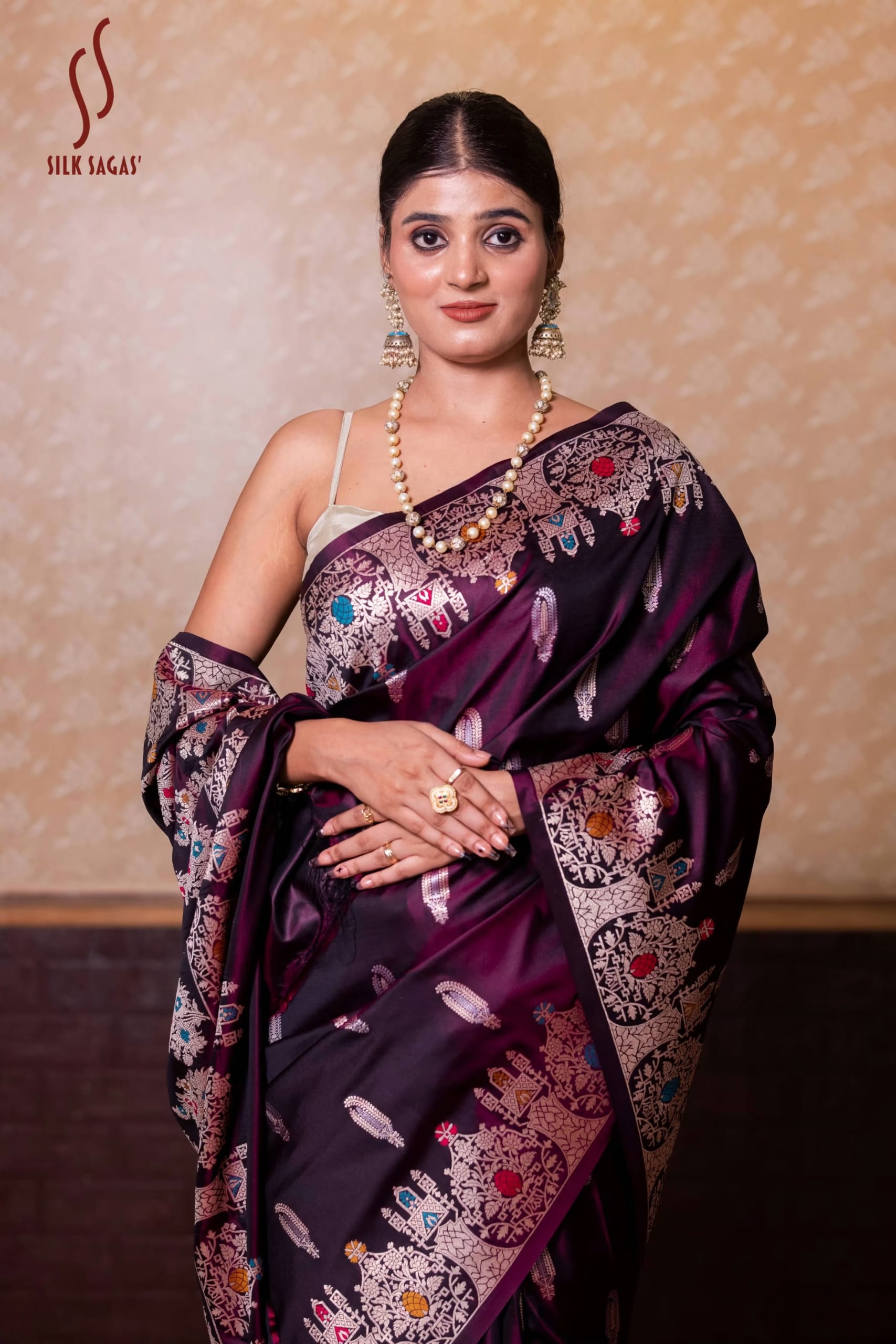 Adorn yourself in the timeless beauty and refined luxury of this Deep Wine Ektara Silk Saree. With its regal hue, intricate zari detailing, and elegant drape, it makes a magnificent statement at weddings, formal gatherings, and festive celebrations.