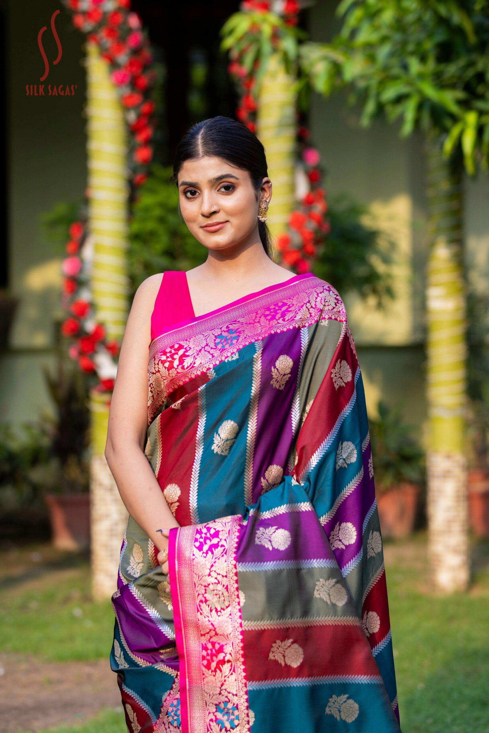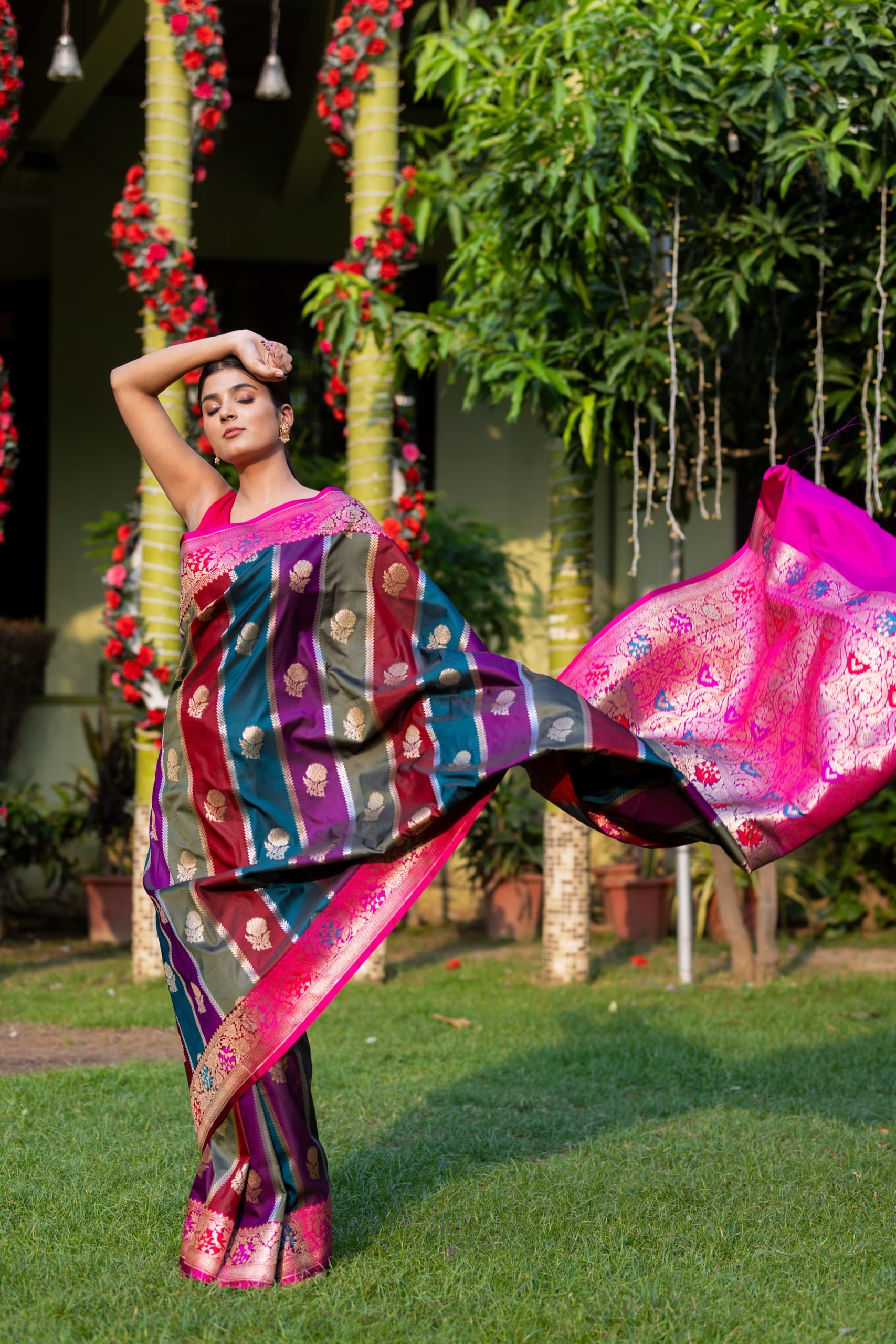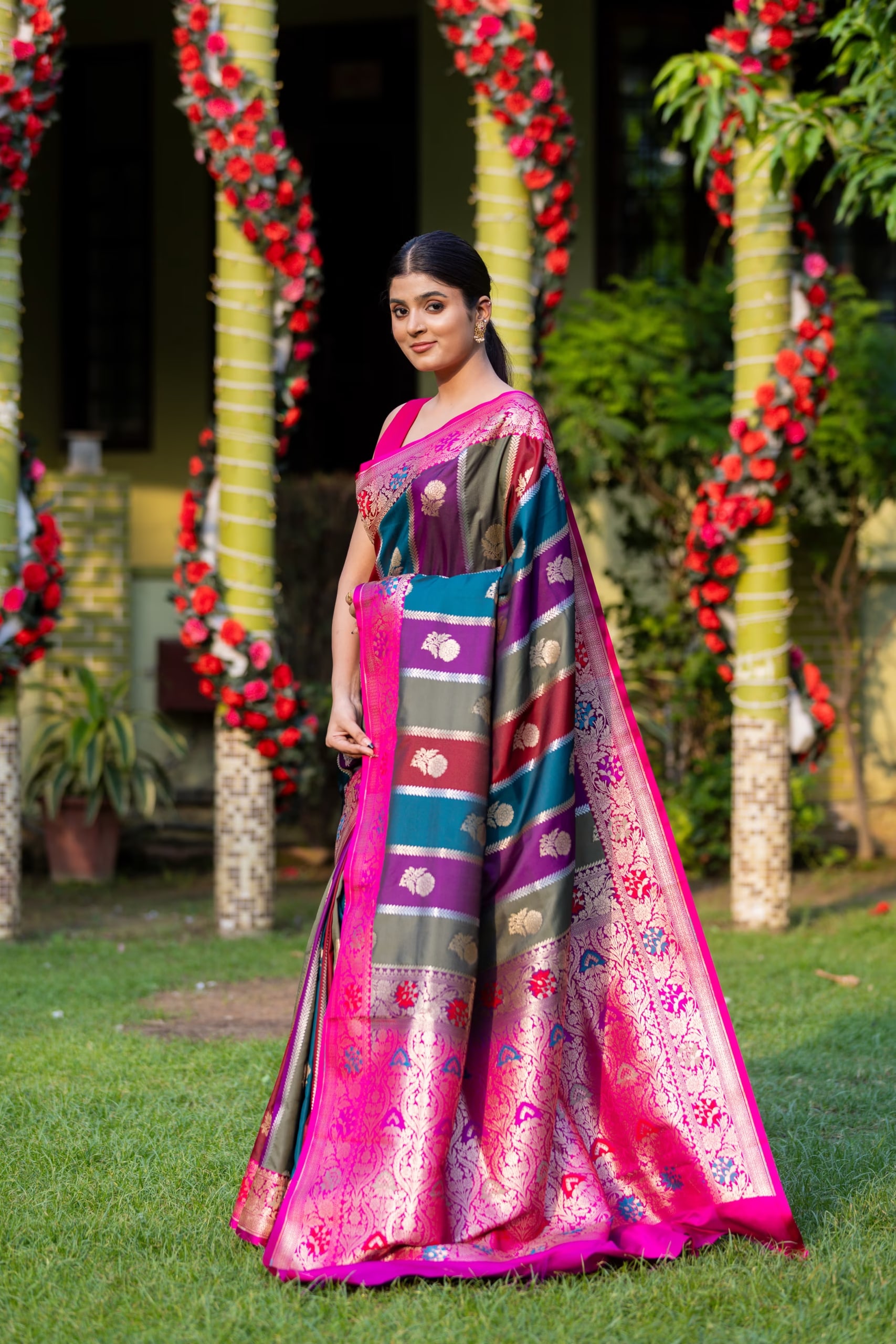 Turn heads with this vibrant designer silk saree, boasting broad stripes of teal, purple, maroon, and olive green. Its soft silk body is adorned with intricate golden zari weaving, while the rich hot pink border and pallu dazzle with traditional motifs. A perfect fusion of bold modern hues and timeless Indian artistry.