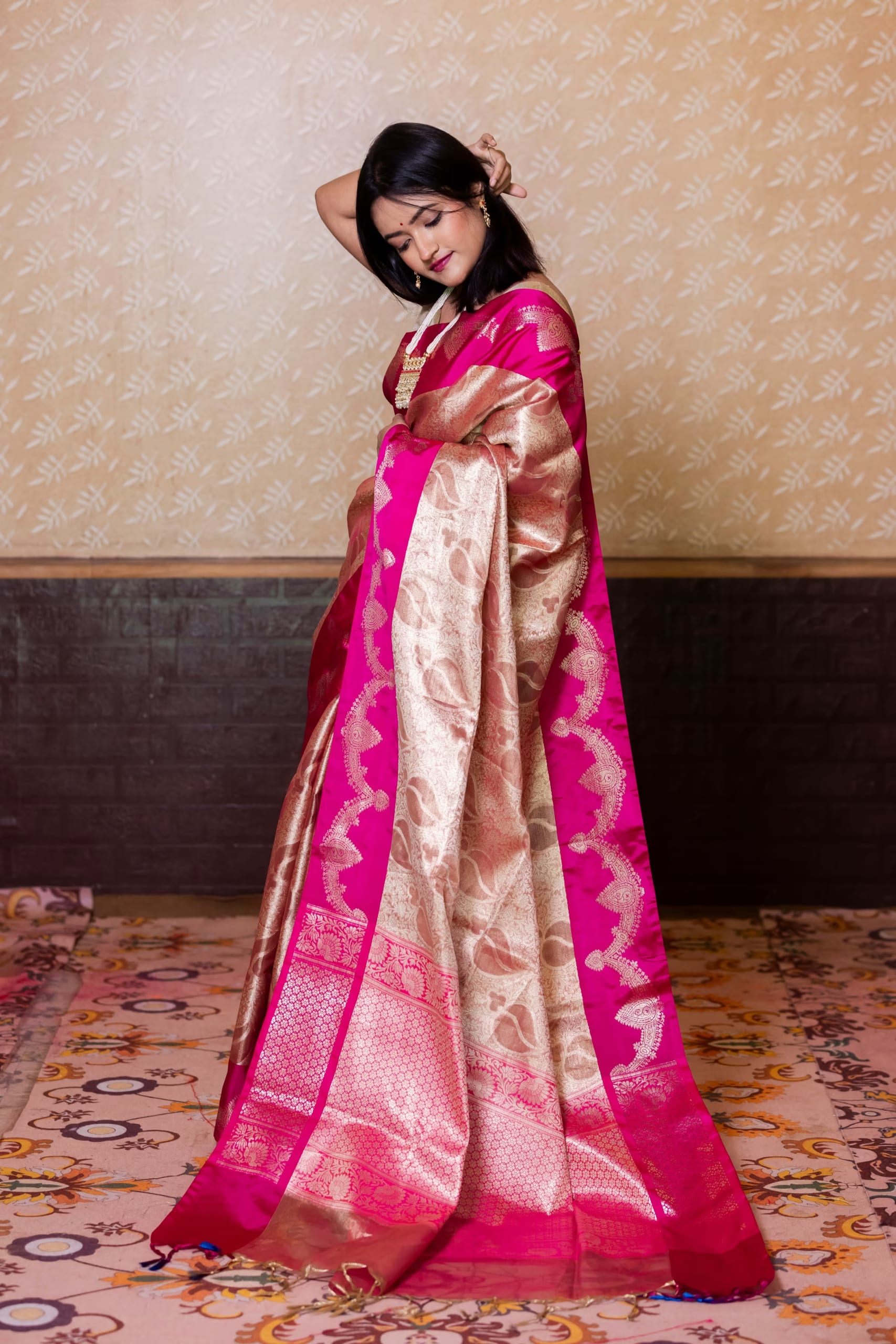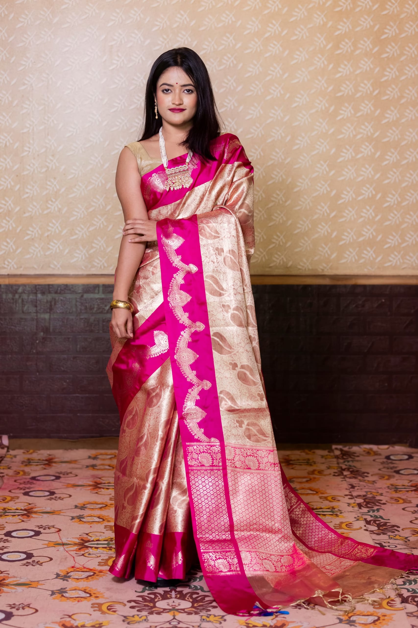 Embrace the glowing elegance of this Gold Pink Glass Tissue Silk Saree, a delicate marvel of light and luxury. Its ethereal gold-pink hue radiates warmth and charm, while the sheer, shimmering texture adds a celestial touch. Crafted from premium glass tissue silk, the saree is lightweight, luminous, and drapes effortlessly with a crisp silhouette. Perfect for festive occasions, garden weddings, or refined gatherings, it shines with subtle sophistication. A graceful treasure for those who seek understated grandeur and poetic elegance.