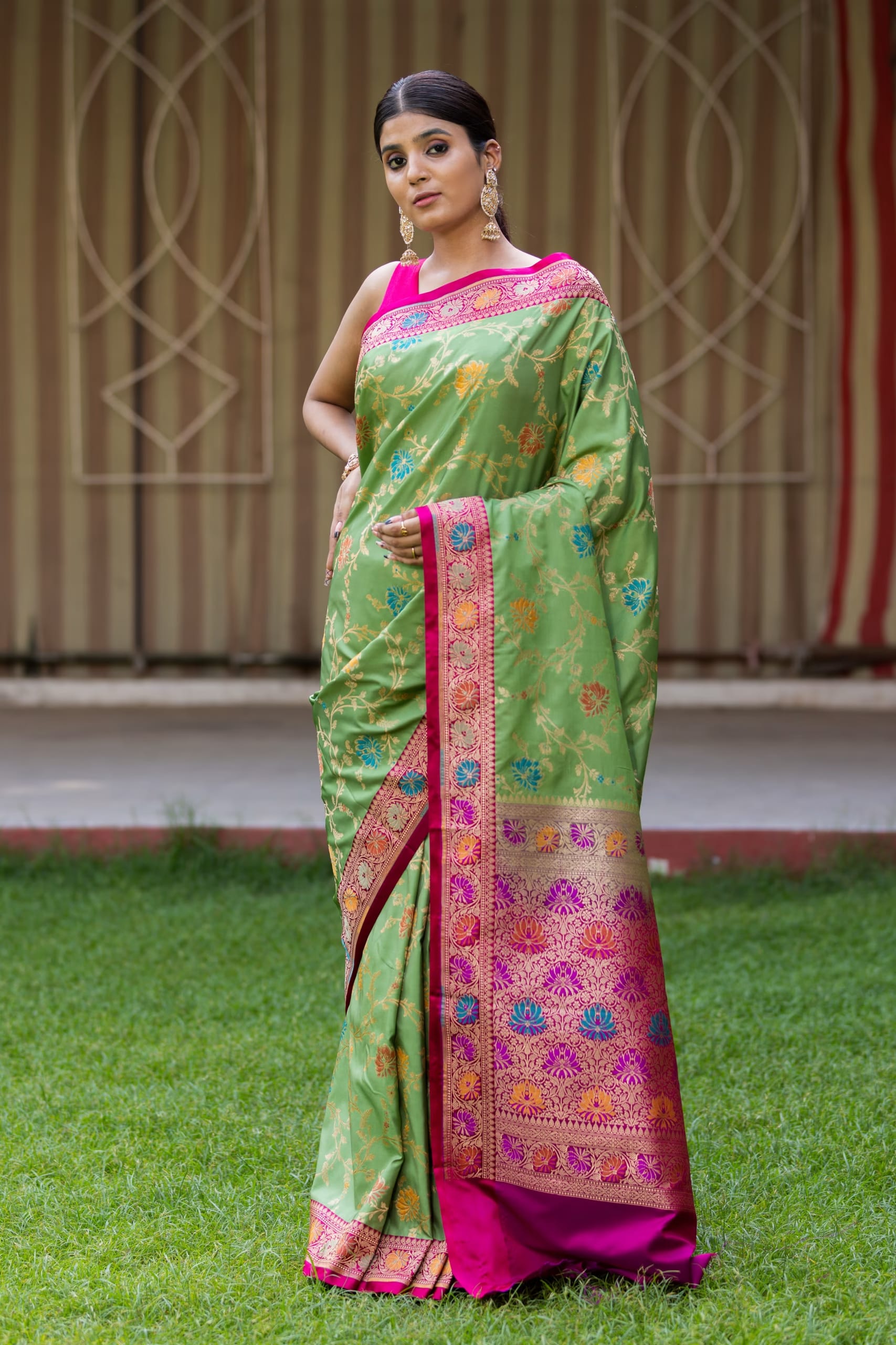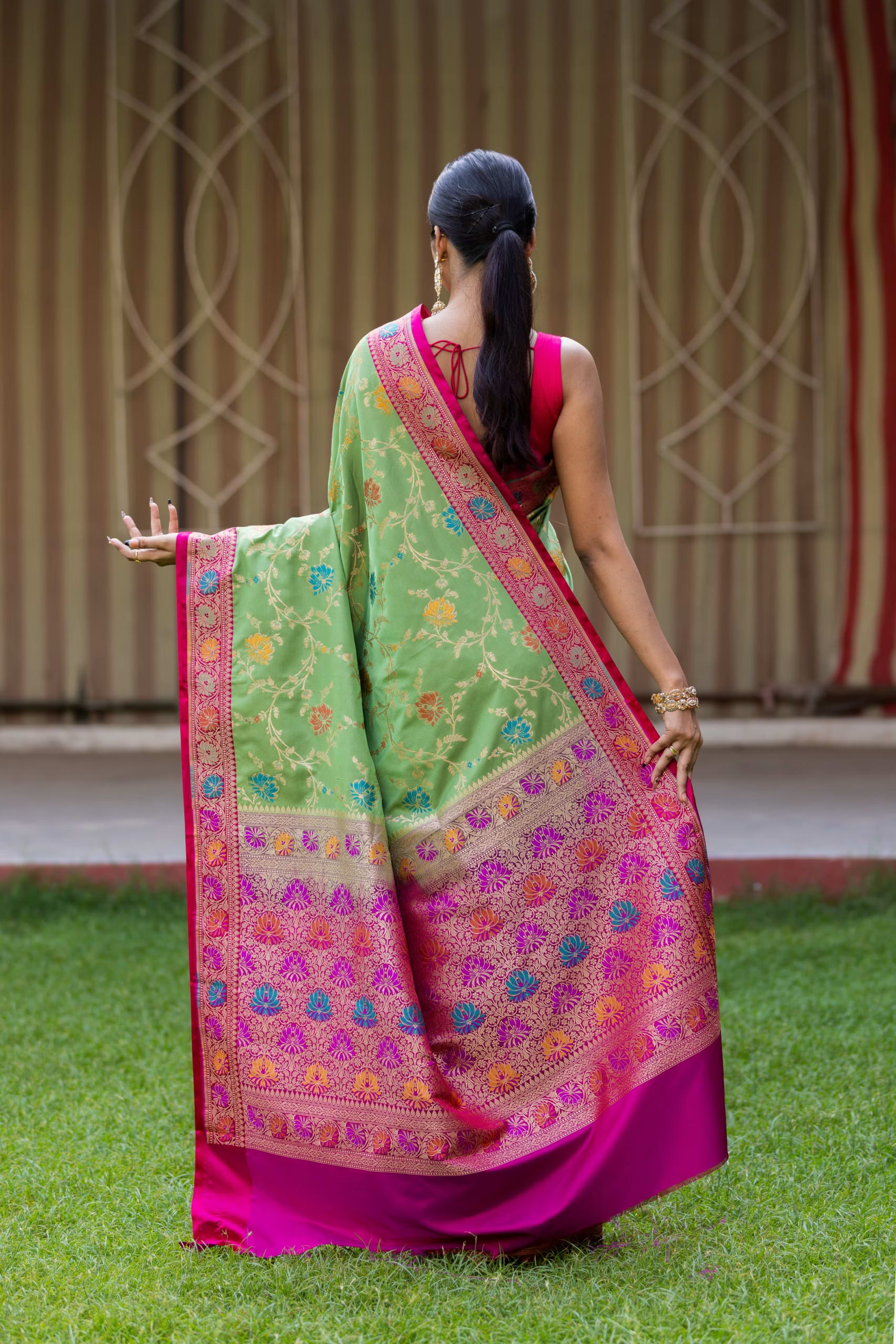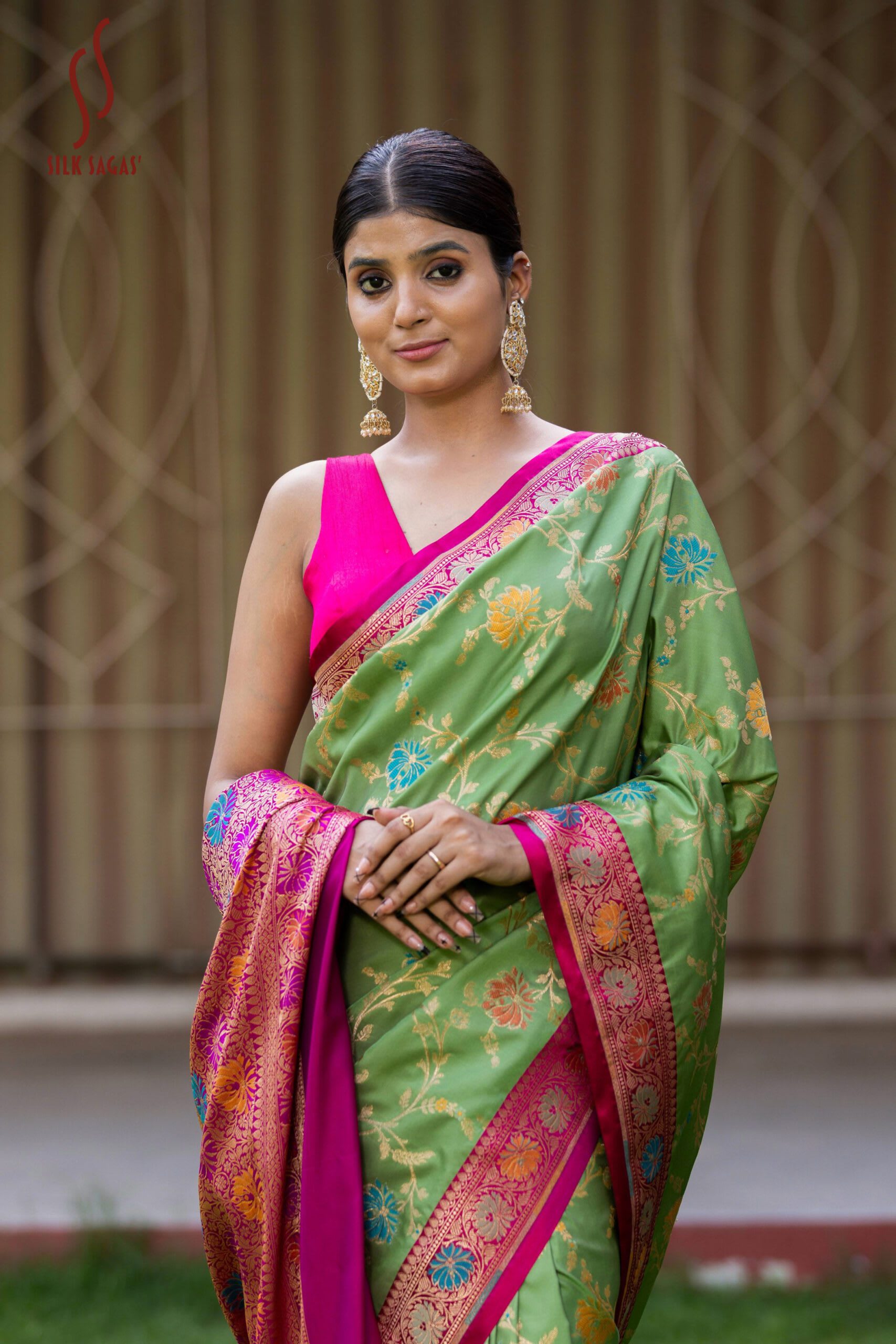 Grace your wardrobe with the serene charm of this Light Green Ektara Banarasi Silk Saree from Silk Sagas. The soft green body is adorned with intricately woven multicolor floral motifs in rich zari, reflecting timeless Banarasi artistry. The deep magenta pink border with gold zari detailing adds a vibrant contrast, lending an air of sophistication and celebration. Crafted in luxurious Ektara silk, this saree offers a rich drape and a luminous sheen—ideal for weddings, pujas, and grand festive occasions. Comes with an unstitched blouse piece in a matching tone.