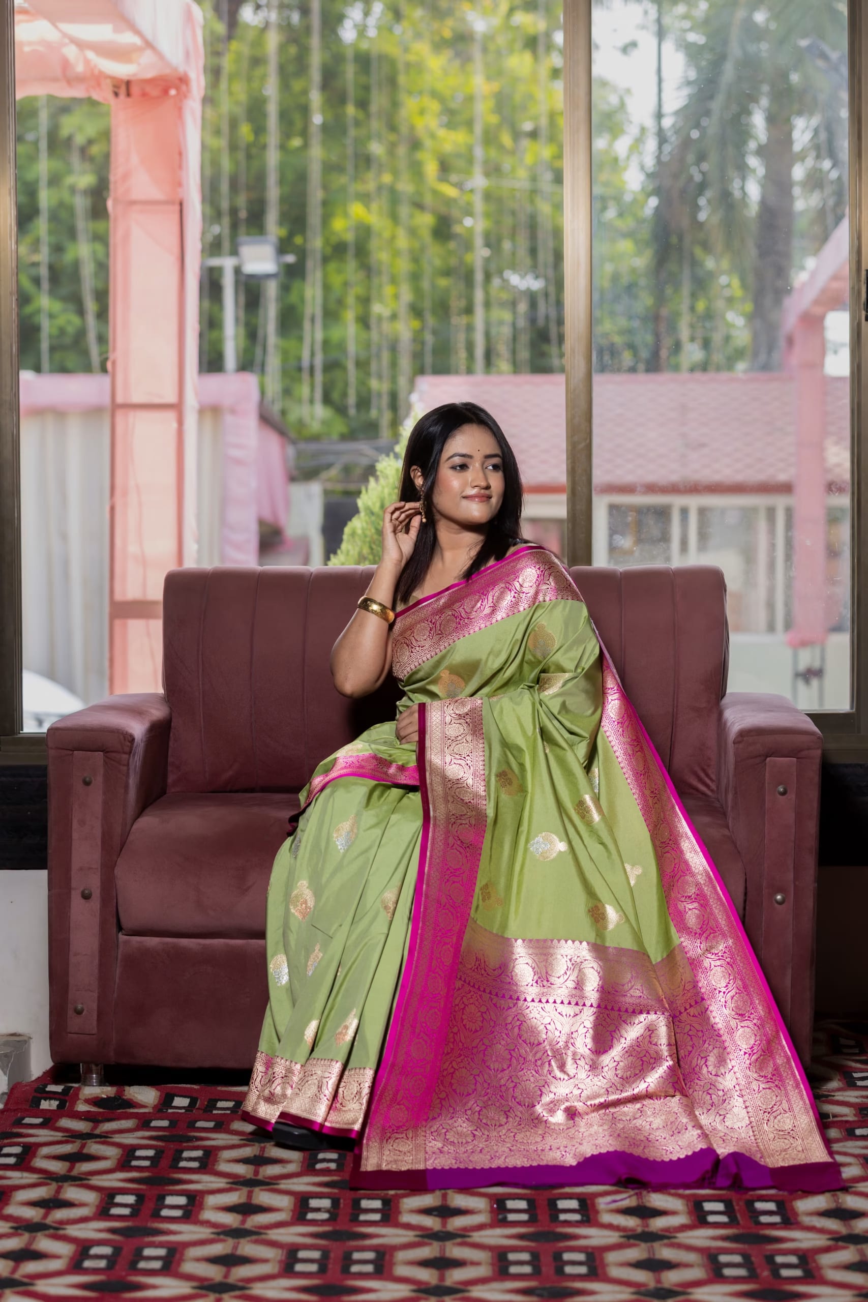 The Muted Green Katan Silk Saree exudes an understated elegance with its soft, pastel green body adorned with delicate zari motifs. The vibrant magenta pink border and pallu, intricately woven with rich golden patterns, offer a striking contrast that enhances its festive charm. This harmonious blend of subtlety and brilliance makes it an ideal choice for weddings, pujas, and cultural celebrations where grace and grandeur unite beautifully.