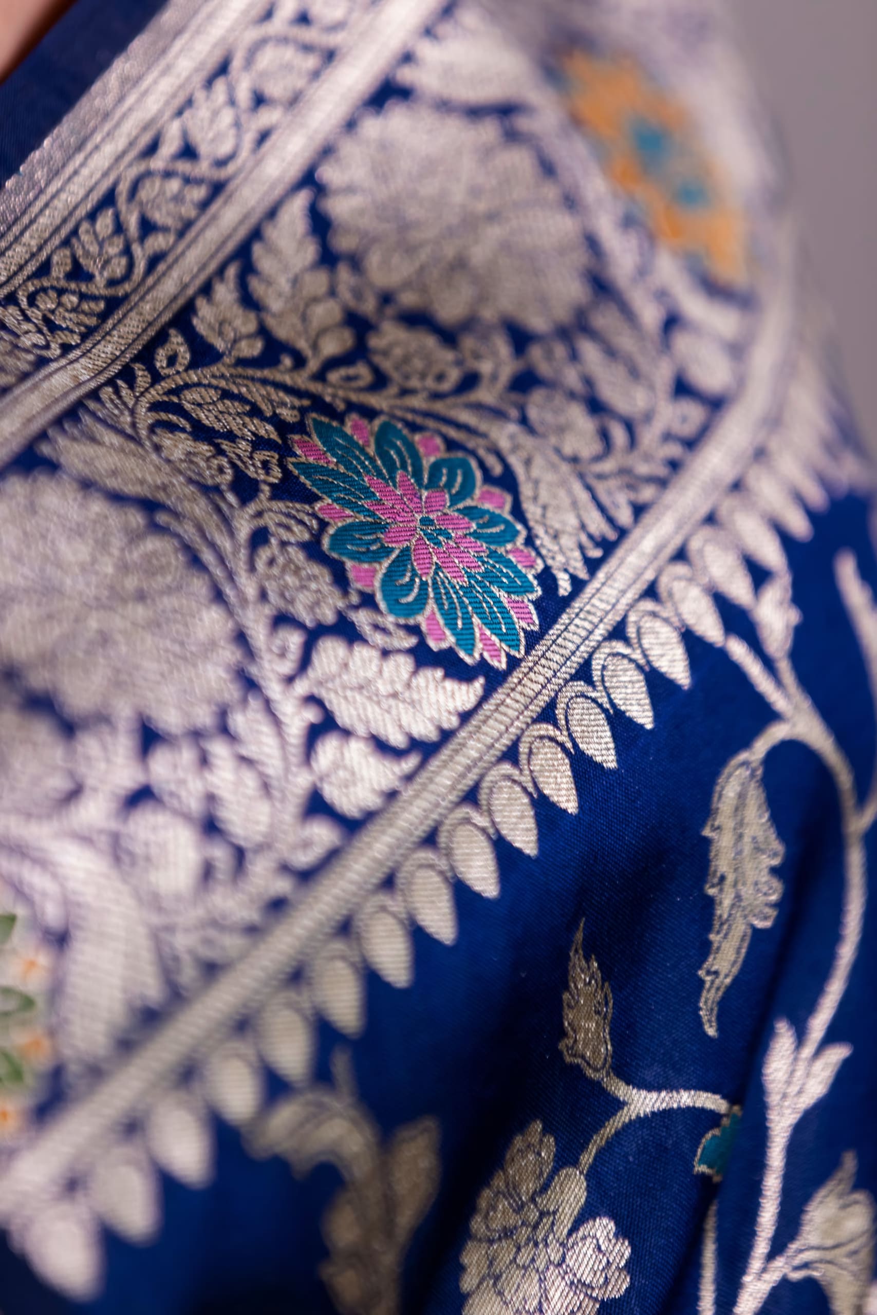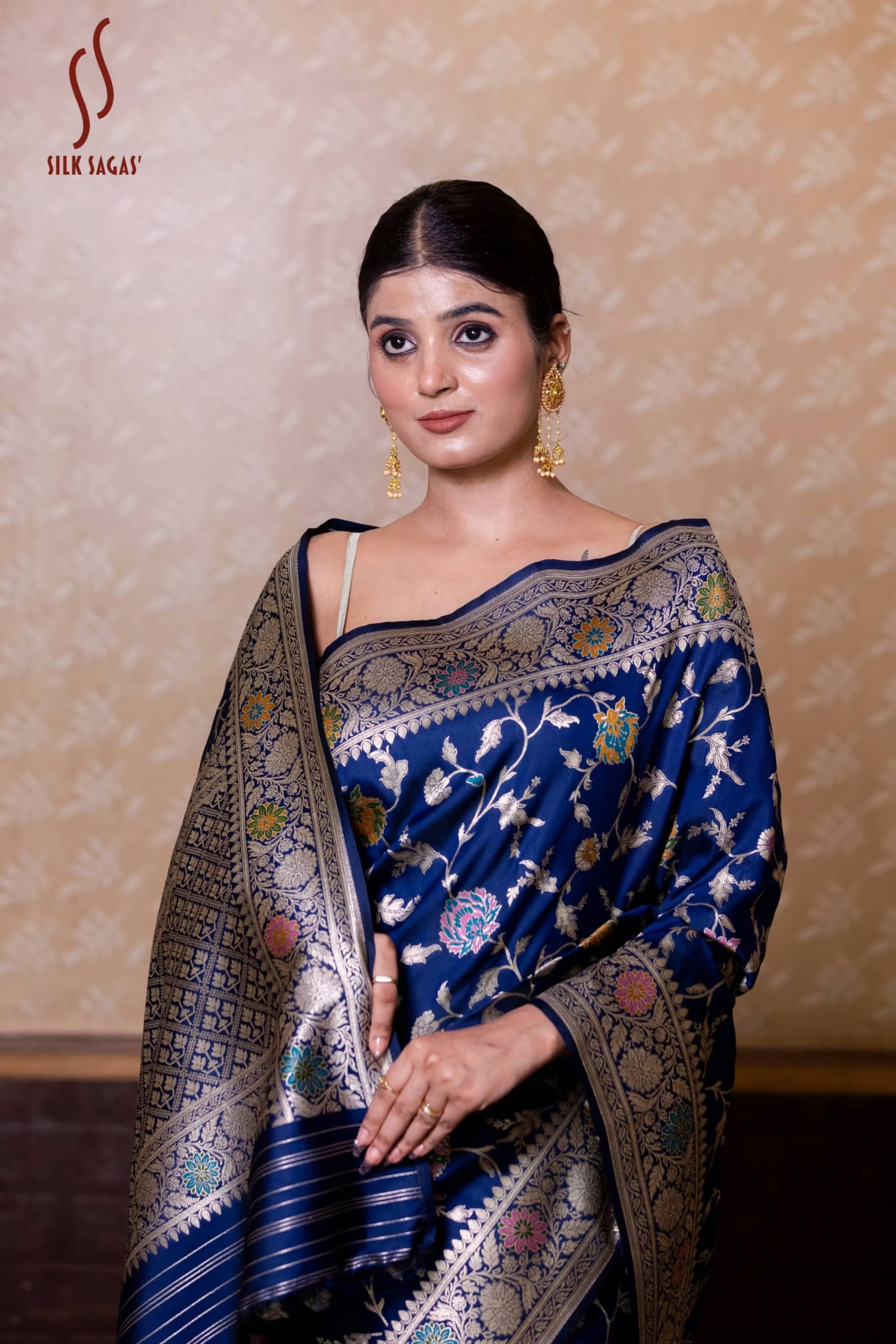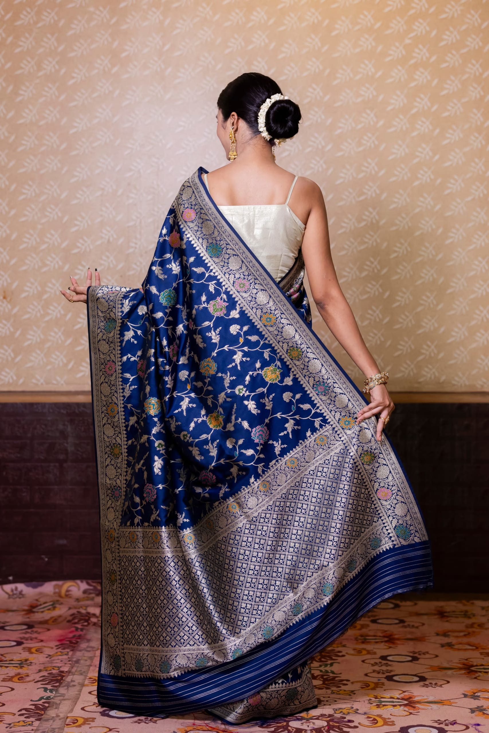 Navy Blue Mashru Silk Banarasi Saree with Mughal Floral Buti and Zari Border – Silk Sagas