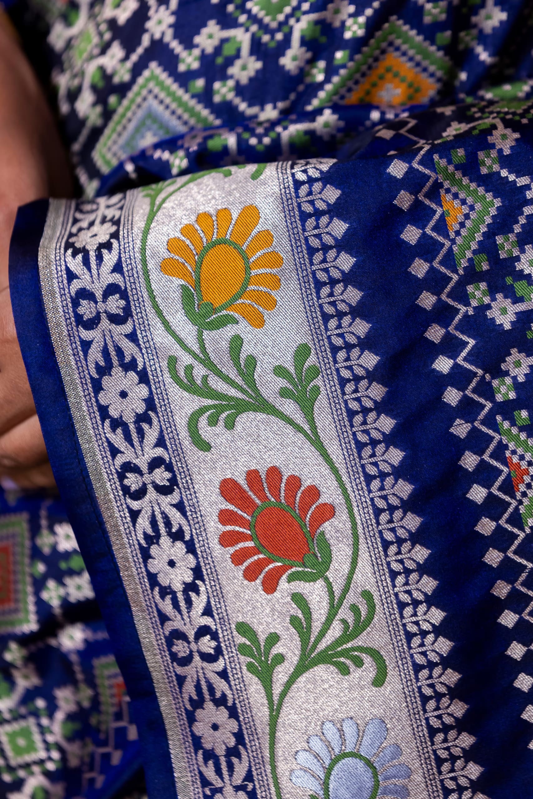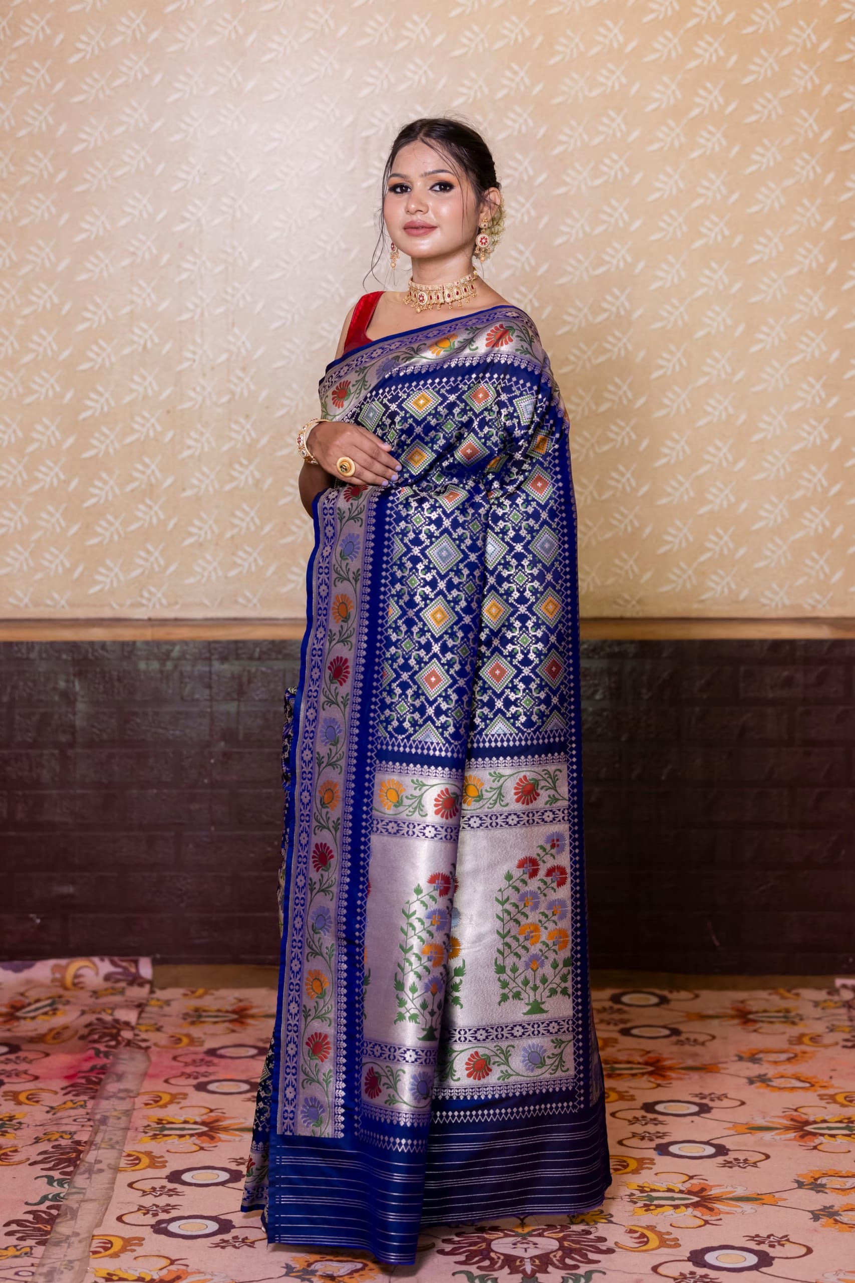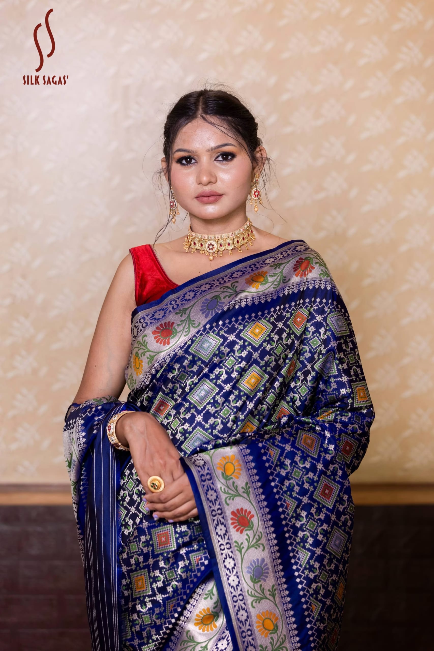 Discover the captivating allure of this Navy Blue Mishru Silk Saree, a true masterpiece that seamlessly blends traditional Indian weaving artistry with a contemporary aesthetic. The deep, rich navy blue hue provides a stunning backdrop for the intricate and vibrant geometric patterns that adorn the body of the saree, reminiscent of classic Indian heritage motifs.