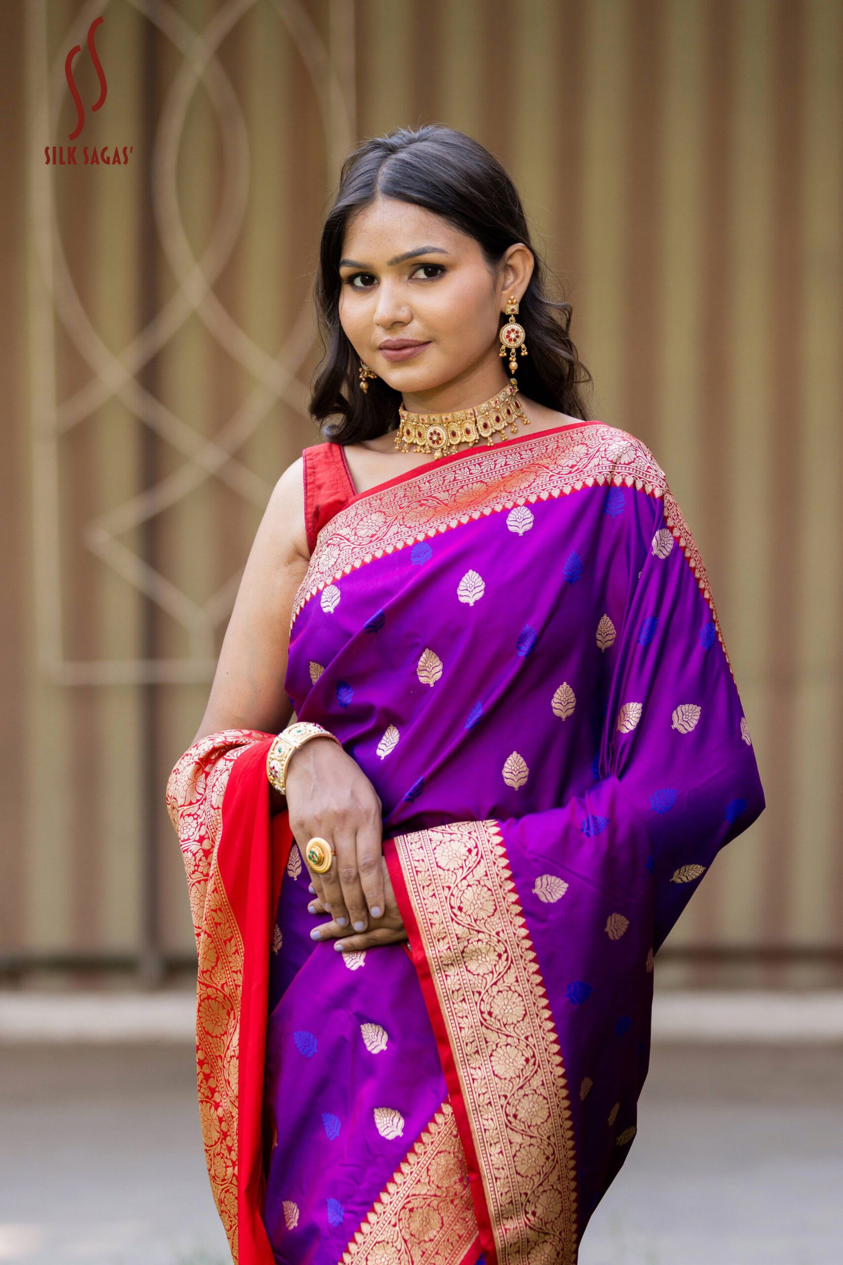 Make a majestic style statement with this elegant Purple Banarasi Soft Silk Saree from Silk Sagas. The deep royal purple hue is beautifully enhanced with golden zari buttas spread evenly across the body, creating a refined and timeless look. The striking red and gold border, adorned with intricate floral motifs, adds a touch of regal grace. Crafted in soft silk for a smooth, luxurious drape, this saree is perfect for festive occasions, wedding events, and traditional gatherings. Comes with a matching unstitched blouse piece to complete your graceful ensemble.