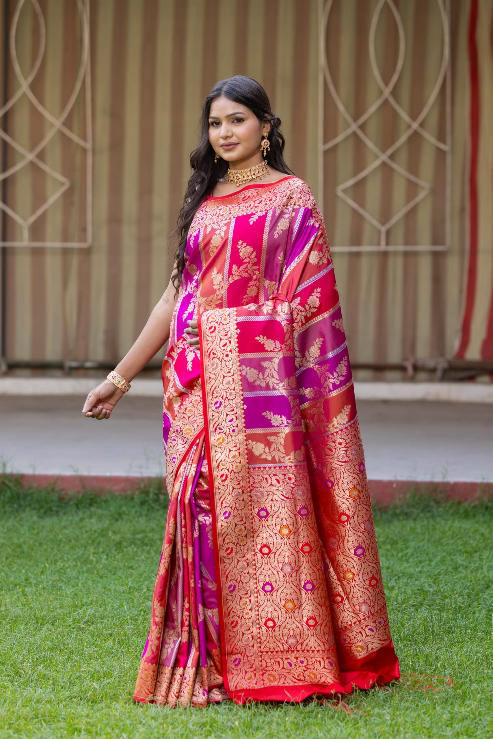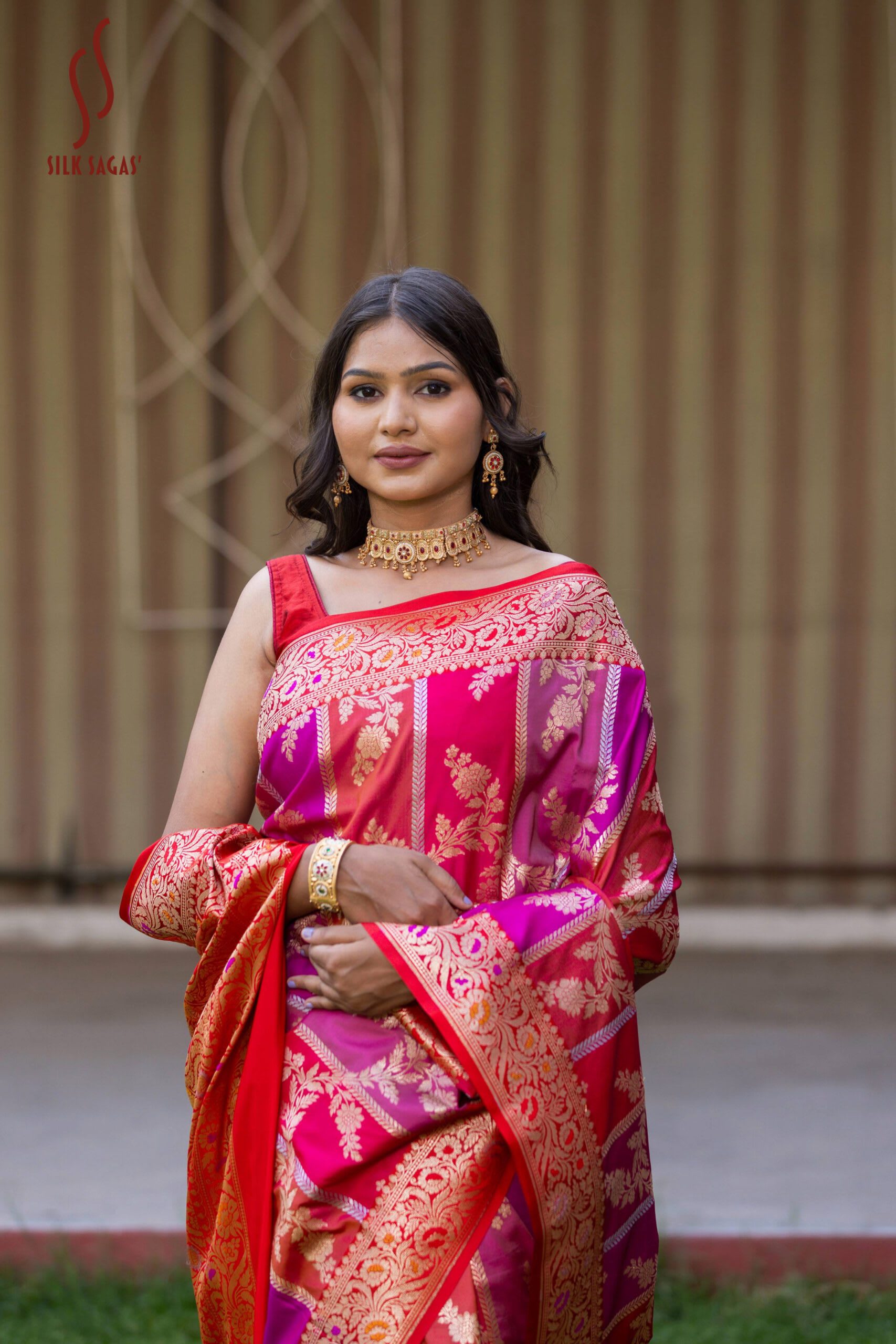 Elevate your ethnic charm with this opulent Rani Pink Designer Silk Saree from Silk Sagas. Woven with meticulous precision, this saree features vibrant pink hues accentuated by rich red borders and intricate golden zari motifs that cascade in floral elegance across the body. The luxurious silk fabric drapes effortlessly, adding regal grace to every movement. Perfect for weddings, festive gatherings, and traditional ceremonies, this masterpiece is paired with a matching blouse piece, making it an irresistible choice for the modern woman who celebrates heritage with style.
