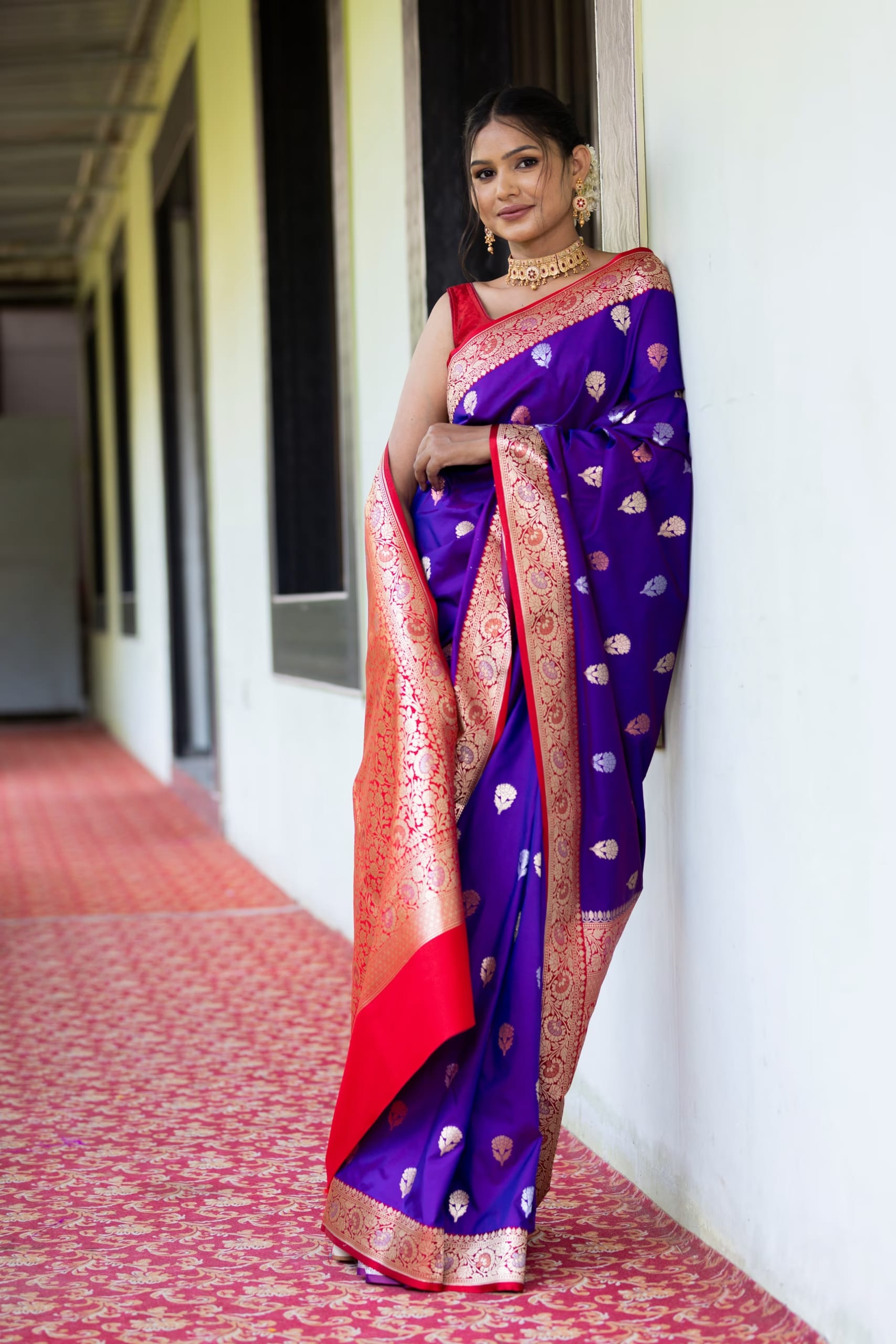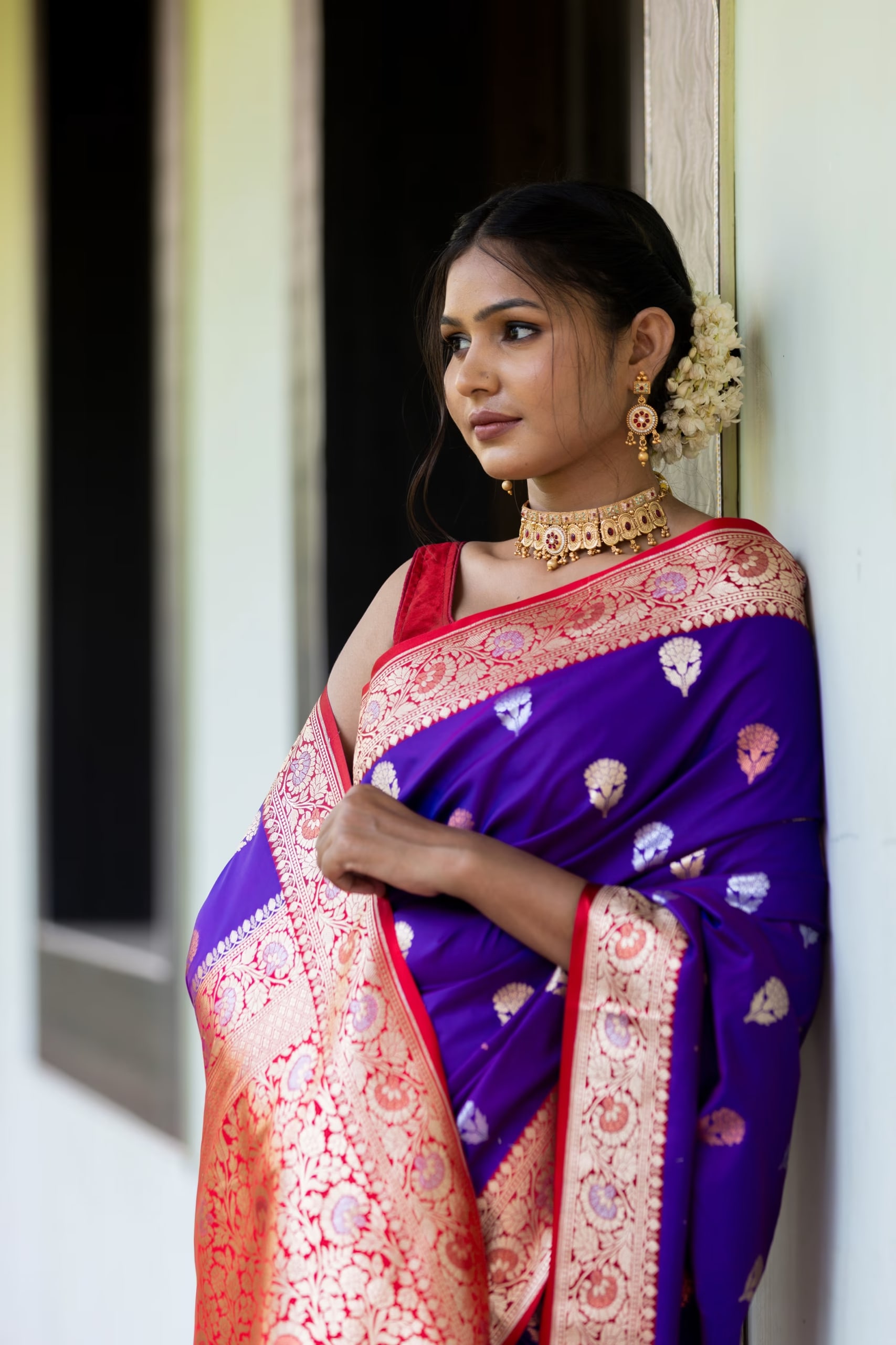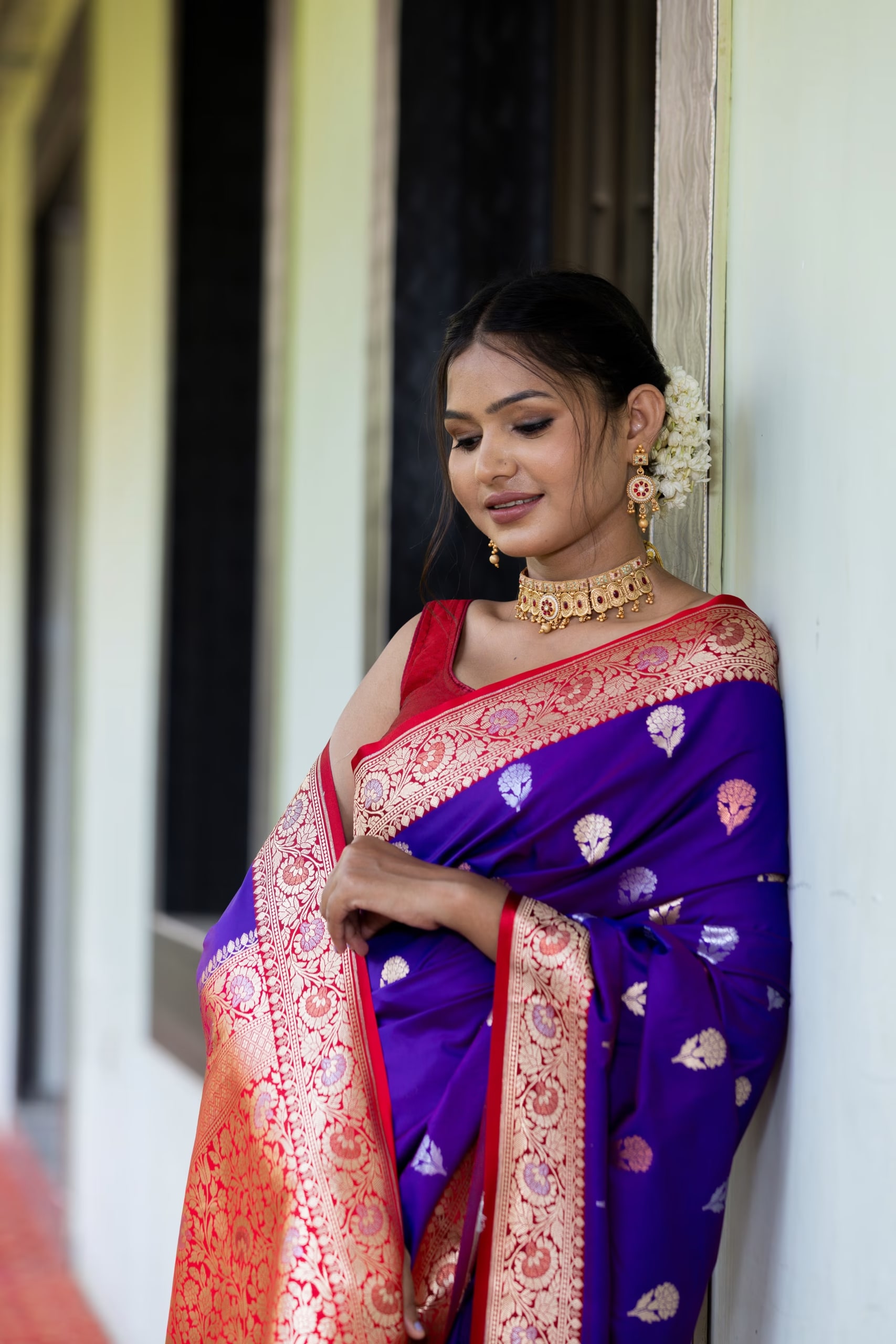 The Royal Blue Katan Silk Saree radiates majestic charm with its rich blue body woven in golden zari floral motifs. Its broad golden border, highlighted with traditional Banarasi artistry, enhances its regal elegance. Subtle hints of pink and green enrich the design, making it a perfect ensemble for weddings, festivities, and cultural celebrations.