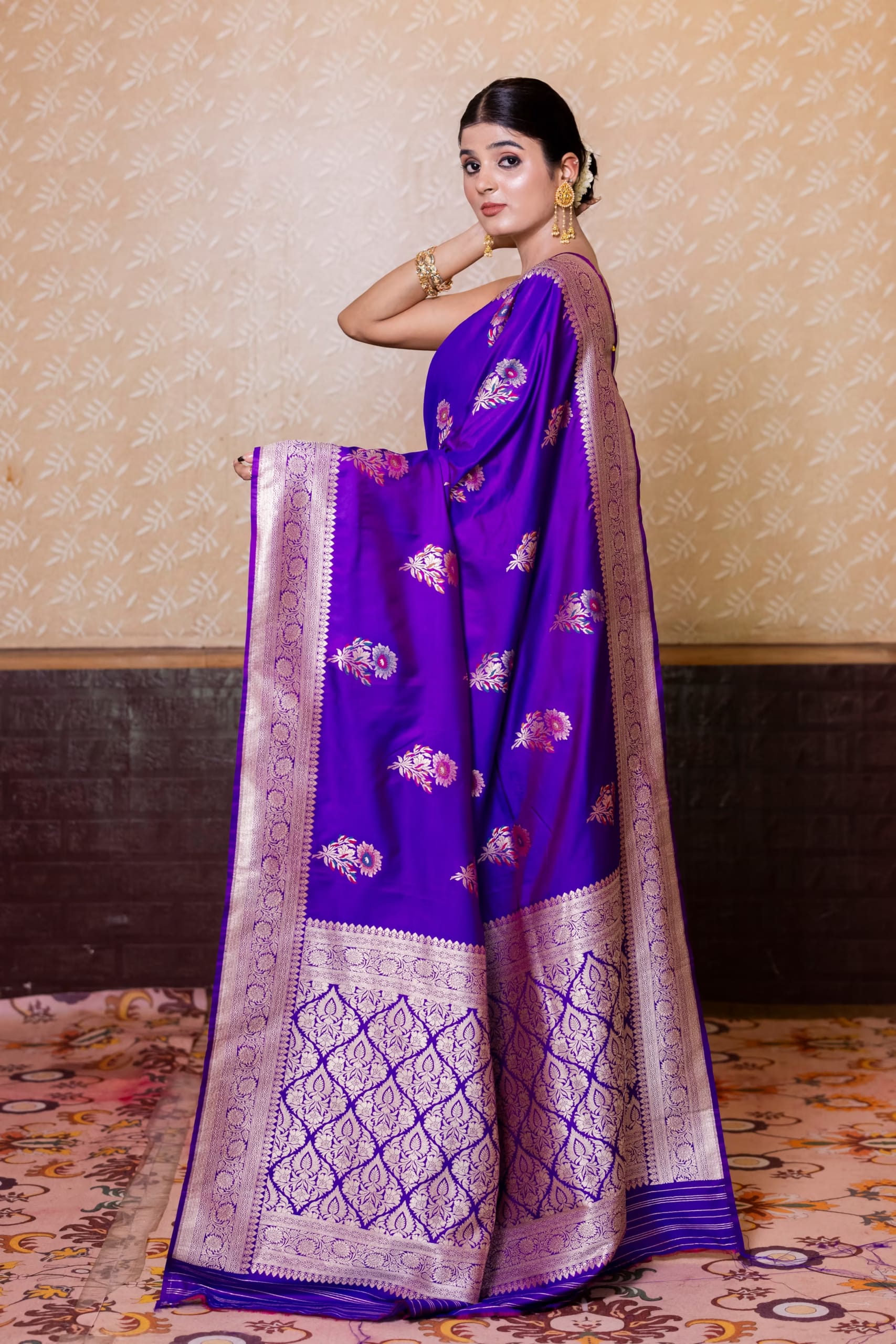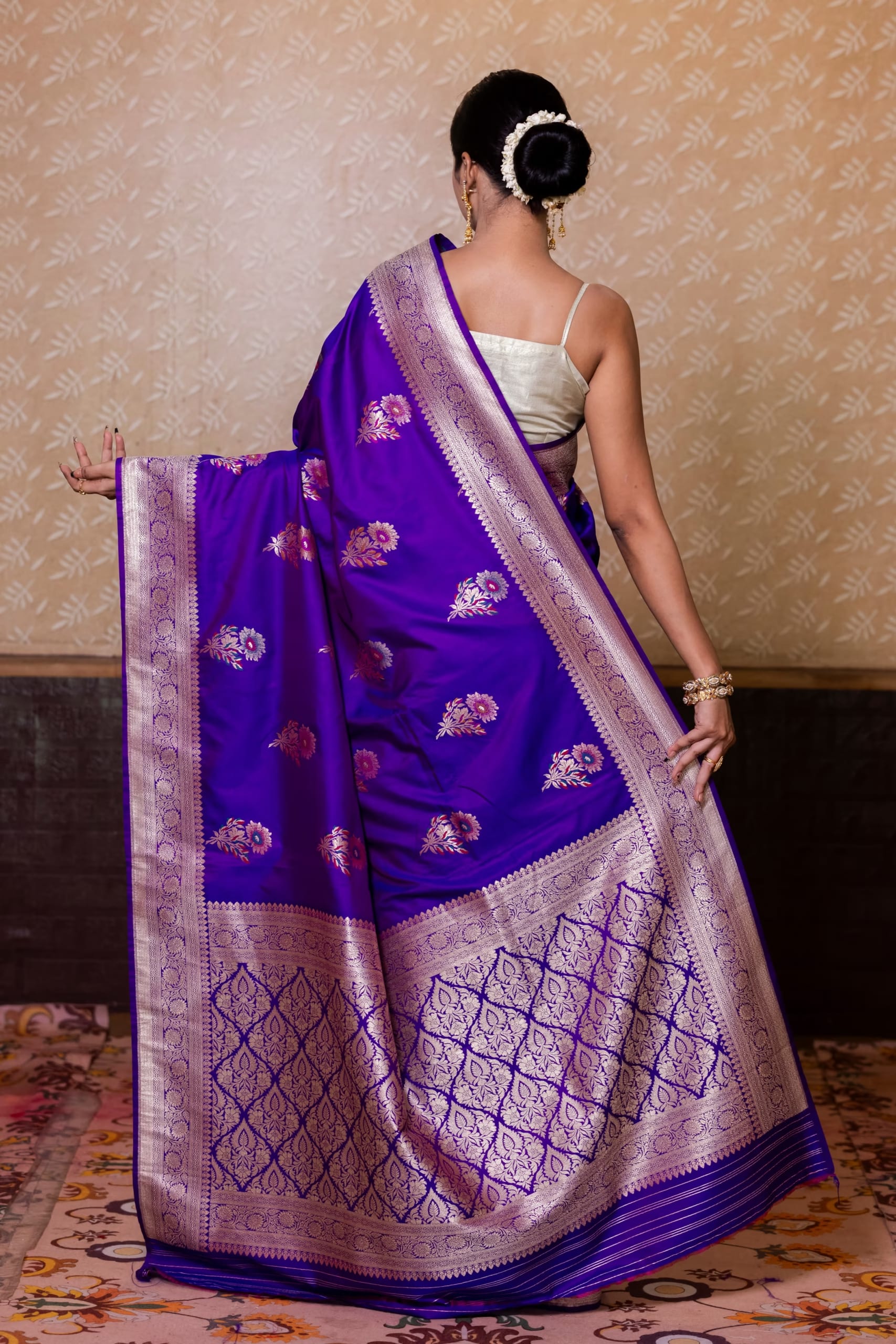 Effect: Traditional motifs in contrasting zari enhancing the regal tone