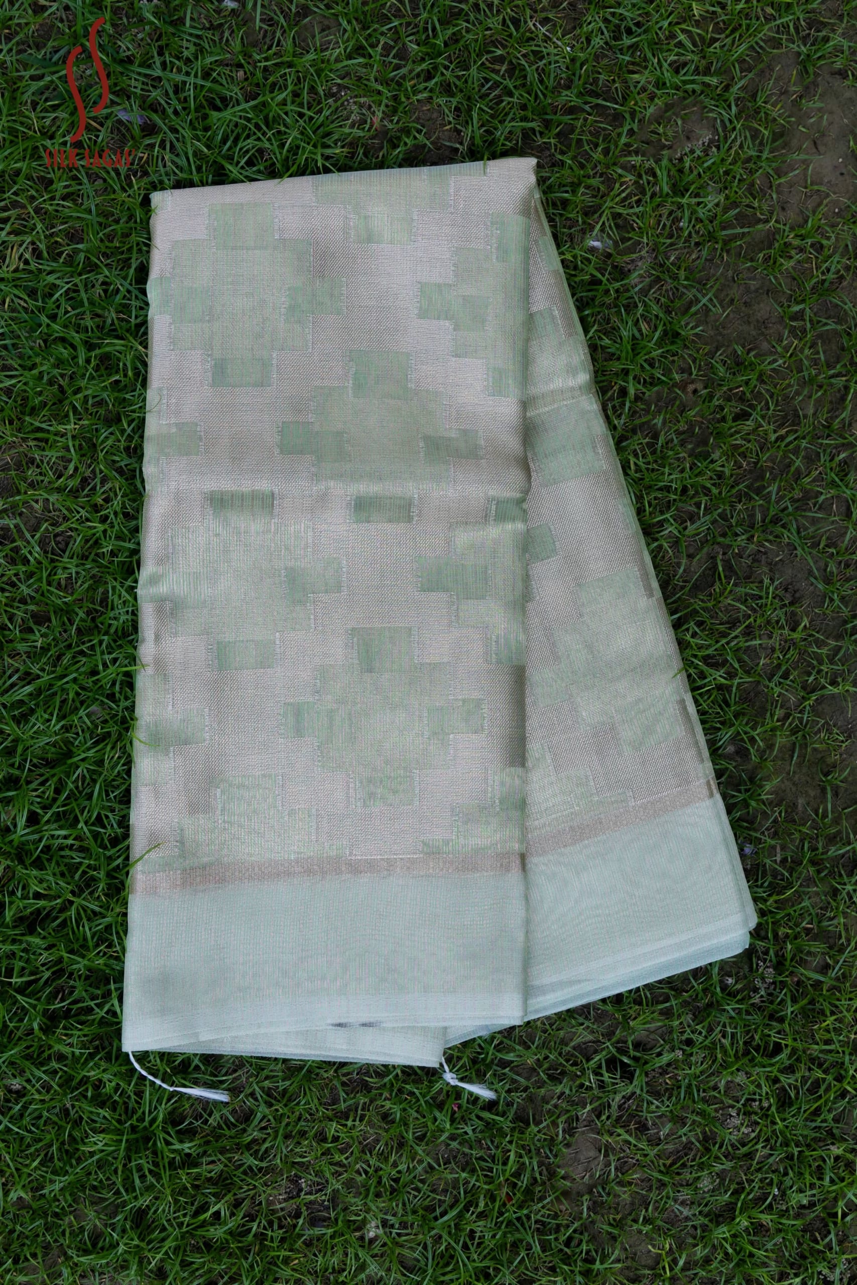 Embrace subtle sophistication with the Sage Bloom Glass Tissue Saree from Silk Sagas. This ethereal drape features a serene sage green base kissed with a soft metallic shimmer, exuding refined elegance. Delicate floral motifs in pastel hues bloom across the saree, adding a whisper of color and charm. Crafted from fine glass tissue silk, it offers a light, airy feel perfect for both day and evening celebrations. Whether you’re attending a festive gathering or a graceful soiree, this saree pairs effortlessly with minimalistic or traditional jewelry for a truly timeless appeal.